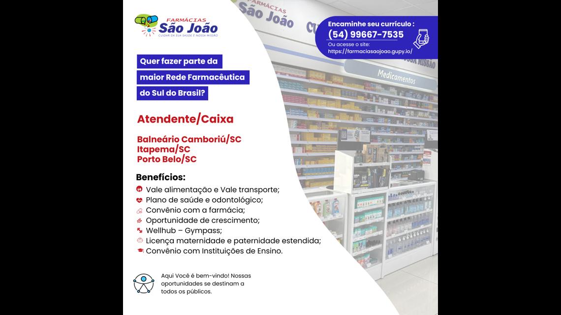 Para o cargo de Atendente, você será responsável por acolher e oferecer o melhor atendimento, de forma humanizada, aos nossos clientes. Superar as suas necessidades ofertando a solução completa com aquisição de produtos e serviços farmacêuticos, além das demais categorias, como, dermocosméticos, conveniência, perfumaria, nutrição e bazar. Zelar pela organização, limpeza e cumprimento de normas sanitárias, a fim de propiciar a melhor experiência aos clientes.