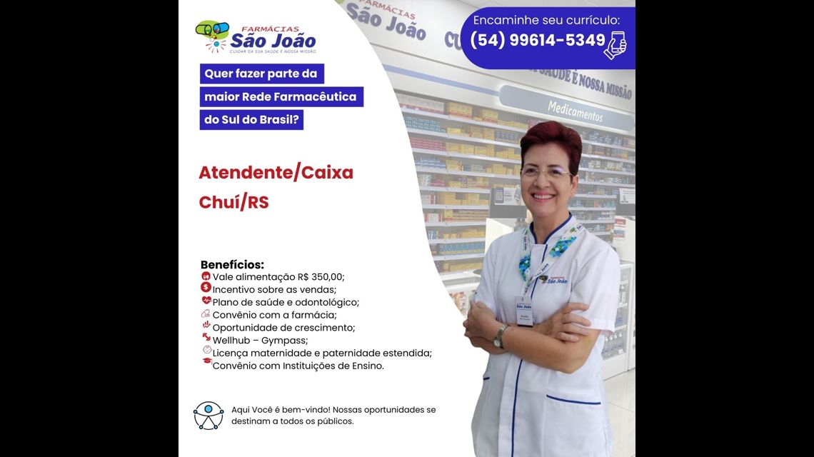 Para o cargo de Atendente, você será responsável por acolher e oferecer o melhor atendimento, de forma humanizada, aos nossos clientes. Superar as suas necessidades ofertando a solução completa com aquisição de produtos e serviços farmacêuticos, além das demais categorias, como, dermocosméticos, conveniência, perfumaria, nutrição e bazar. Zelar pela organização, limpeza e cumprimento de normas sanitárias, a fim de propiciar a melhor experiência aos clientes.